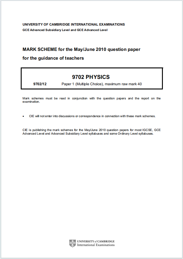 这份评分方案是 2010年5月至6月 CIE AS-Level 物理课程 Paper 2 (Structured Questions) 的官方评分指南,为教师和考官提供了标准化的评分依据。评分方案确保了考试评分的公平性和一致性,同时也是教师在教学中评估学生表现的重要参考资料。