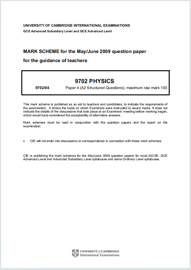 这是 剑桥国际考试(CIE)9702 Physics 课程 的 2009年5/6月考试(May/June 2009) Paper 5(Planning, Analysis and Evaluation) 的评分标准(Mark Scheme)。以下是对这份文件的详细分析和解读: