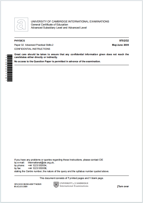 这是剑桥国际考试(Cambridge International Examinations,简称 CIE)的一份 物理试卷(Physics Paper 32: Advanced Practical Skills 2) ,属于 Advanced Subsidiary Level (AS Level) 和 Advanced Level (A Level) 的考试系列。以下是对这份试卷的分析和说明: