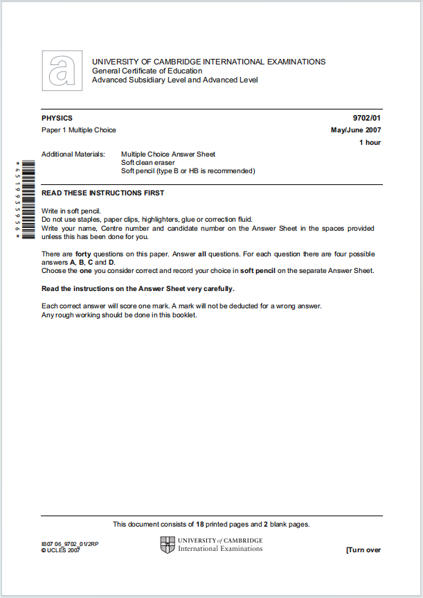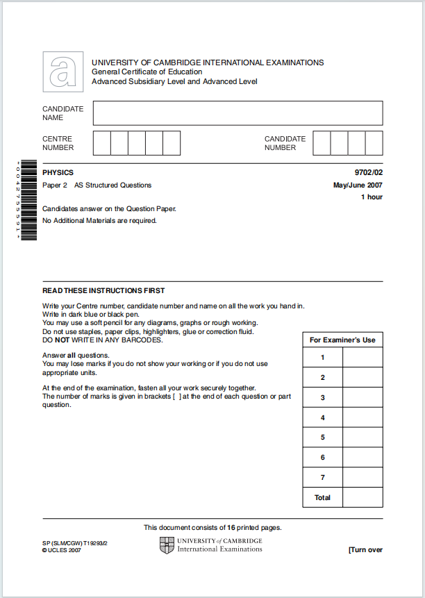这是 剑桥国际考试委员会(CIE) 发布的 2007年5/6月 A-Level 物理(9702)Paper 4 的试卷页。