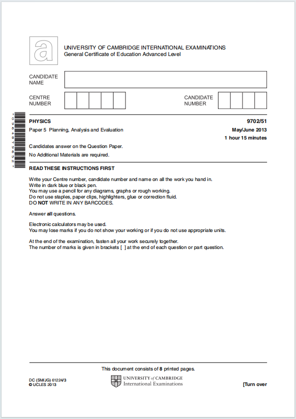 这是 剑桥国际考试(CIE)A-Level 物理 的 Paper 5: Planning, Analysis and Evaluation(规划、分析与评估) 试卷,考试代码为 9702/51,时间为 2013年5月至6月。