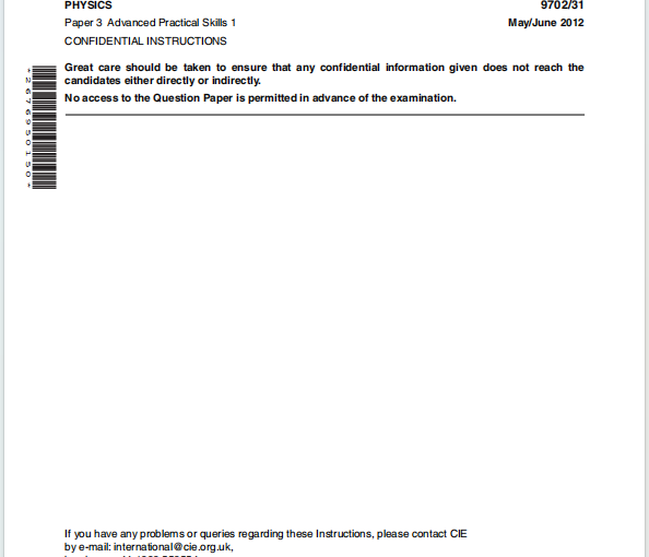 这是 剑桥国际考试(CIE) 的 A-Level 物理试卷,具体为 Paper 3: Advanced Practical Skills 1,考试代码 9702/31,时间为 2012年5月至6月。