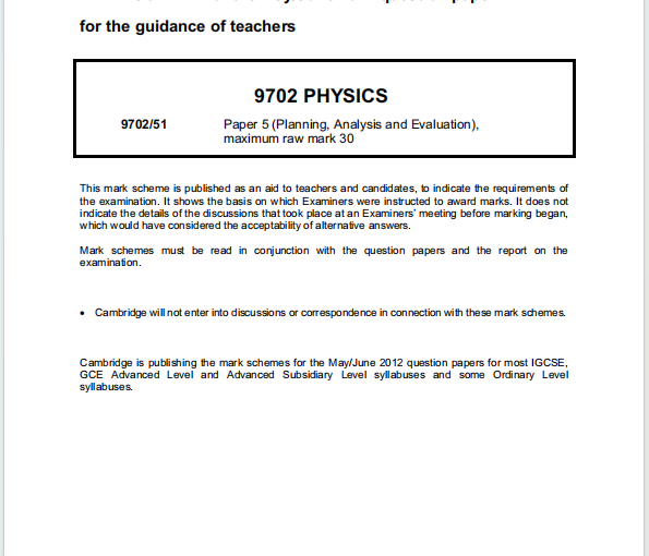 Alevel剑桥物理2012年真题评分方案下载《Cambridge A-Level Physics Paper 5 Planning, Analysis and Evaluation Mark Scheme May/June 2012》