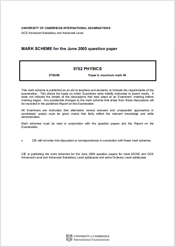 这份评分标准是 A-Level 物理考试(9702)2005 年 6 月 Paper 6 的官方评分依据,主要用于指导教师评分和帮助学生备考实验与数据分析部分。通过研究评分标准,学生可以更清楚地了解考试要求和得分点,从而有针对性地提高实验技能和答题能力。