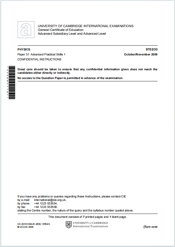 这是 剑桥国际考试(CIE)9702 Physics 课程 的 2009年10/11月考试(October/November 2009) Paper 33(Advanced Practical Skills 1) 的 机密说明(Confidential Instructions) 文件。以下是对这份文件的分析与解读: